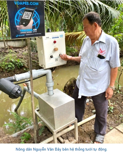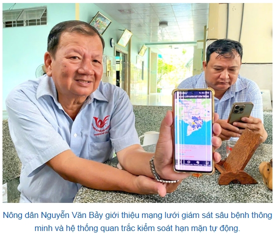 Năm 2021, ông Bảy được một công ty tài trợ kinh phí lắp đặt mạng lưới giám sát sâu bệnh thông minh và hệ thống quan trắc kiểm soát hạn mặn tự động. Phần mềm của mạng lưới được cài vào điện thoại nên hàng ngày, ông đều nắm thông tin dịch bệnh và chia sẻ lên nhóm Zalo của 63 thành viên trong HTX để có giải pháp xử lý thích hợp.