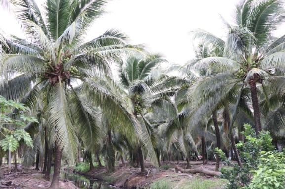 Vườn dừa xiêm dứa ở phường Long Đức, tỉnh Vĩnh Long (địa bàn tỉnh Trà Vinh trước sáp nhập 3 tỉnh Vĩnh Long, Bến Tre, Trà Vinh). Ảnh: Thanh Hòa/TTXVN.