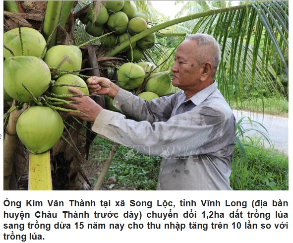 Thời gian qua, mô hình chuyển đổi từ đất trồng lúa sang trồng dừa trên địa bàn tỉnh Vĩnh Long (sau sáp nhập tỉnh Bến Tre, Vĩnh Long, Trà Vinh) mang lại hiệu quả kinh tế rõ rệt, trồng dừa cho lãi gấp 3 lần trồng lúa, giúp nhiều gia đình ở nông thôn nâng cao thu nhập, cải thiện đời sống.