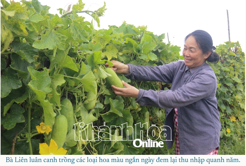 Tận dụng nguồn nước tưới từ mương thủy lợi, bà trồng dưa leo trên diện tích 2.500m2. Vào tháng Giêng âm lịch hằng năm, bà bắt đầu trồng dưa leo. Sau khi thu hoạch dưa leo, bà phát dọn cỏ, cải tạo và cho đất nghỉ ngơi. Đến tháng 4 âm lịch, bà luân canh trồng bí chanh trên luống và giàn trồng dưa leo trước đó. Nhờ chăm sóc kỹ, bí chanh ít sâu bệnh nên mỗi vụ thu hoạch kéo dài 2 tháng. Các sản phẩm của bà được thương lái thu mua tại chỗ. Cùng với đó, bà đầu tư trồng dưa hấu trên diện tích 2.500m2 và hái bán lẻ cho người dân địa phương. Sau khi thu hoạch xong dưa hấu, bà tiếp tục trồng bí chanh trên diện tích này. Cứ thế, vợ chồng bà luân canh trồng các loại hoa màu ngắn ngày, đem lại nguồn thu nhập quanh năm. Mỗi năm, với 1ha trồng hoa màu và mía, bà bán nông sản được hơn 220 triệu đồng. Sau khi trừ chi phí, bà thu về khoảng 115 triệu đồng.
