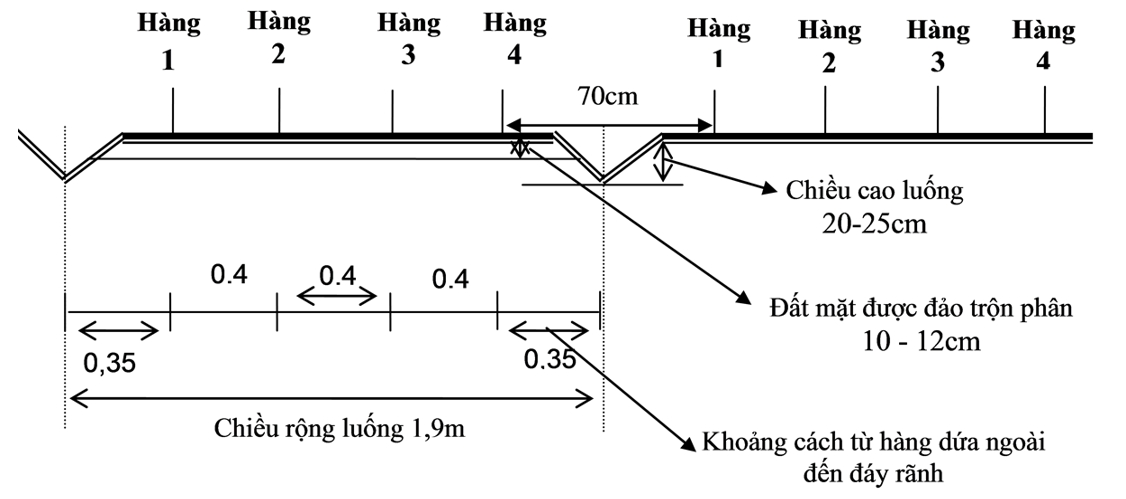 - Khoảng cách giữa các luống: Để thuận tiện cho khâu chăm sóc khoảng cách giữa hai mép luống nên để 30 cm, như vậy khoảng cách giữa các hàng rìa ngoài mép luống sẽ là 70 cm