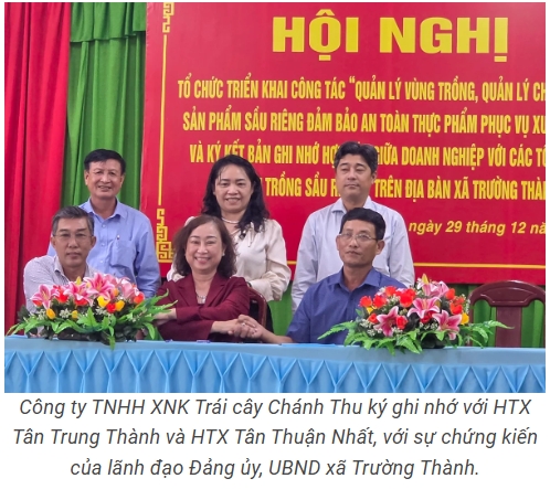 Ngày 29-12, tại Trung tâm Văn hóa xã Trường Thành, UBND xã Trường Thành chủ trì phối hợp các đơn vị, doanh nghiệp liên quan tổ chức hội nghị triển khai công tác quản lý vùng trồng, quản lý chất lượng sản phẩm sầu riêng đảm bảo an toàn thực phẩm phục vụ xuất khẩu và ký kết ghi nhớ hợp tác giữa doanh nghiệp với các tổ chức, cá nhân trồng sầu riêng trên địa bàn xã.