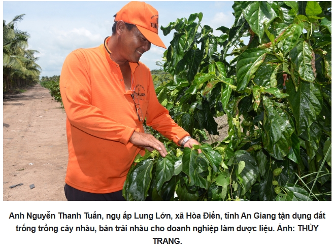 Anh Nguyễn Thanh Tuấn - chủ trang trại sản xuất lúa hữu cơ Tuấn Linh, ngụ ấp Lung Lớn, xã Hòa Điền(tỉnh An Giang) tận dụng diện tích đất trống dọc bờ bao xung quanh đồng ruộng để trồng cây nhàu. Cách làm này không chỉ giúp tăng khả năng chắn gió, giữ đất mà còn mang lại thu nhập khá từ việc bán trái nhàu cho các đơn vị sản xuất dược liệu.