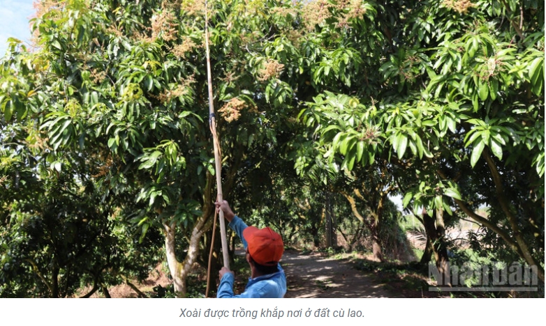 Là vùng đất cù lao, Cù Lao Giêng được gọi là cù lao xoài đúng như tên gọi. Xoài hiện hữu các nơi, trong vườn, trước sân nhà, men theo các đường lộ đâu đâu cũng thấy xoài trổ bông vàng ươm. Ông Võ Minh Nâng, Bí thư Đảng ủy xã Cù Lao Giêng thông tin, tổng diện tích đất sản xuất nông nghiệp 4.278,59 héc-ta thì xoài chiếm 4.135,4 héc-ta, trong đó, sản xuất xoài vụ nghịch với diện tích hơn 1.000 héc-ta cho sản lượng 7.033 tấn.