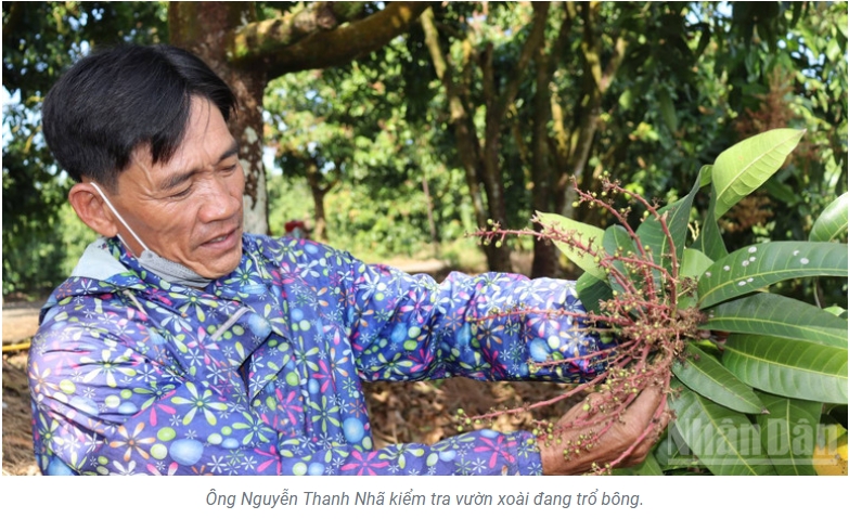 Ông Nhã tâm sự: “Tôi làm lúa hơn 25 năm, đến năm 2016 trong vùng này chuyển đất lúa sang trồng xoài do lợi nhuận cao hơn nên tôi chuyển năm công đất ruộng sang đất vườn. Trồng xoài vui buồn lẫn lộn, lúc xoài có giá, trừ chi phí, một vụ lời vài trăm triệu là bình thường”.