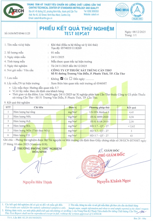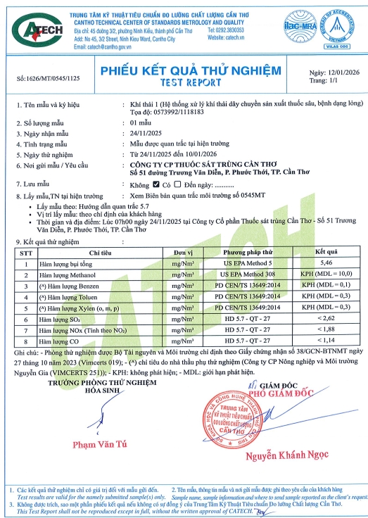 Trung tâm Kỹ thuật Tiêu chuẩn Đo lường Chất lượng Cần Thơ đã thực hiện lấy mẫu và phân tích các mẫu về môi trường tại Công ty CP Thuốc sát trùng Cần Thơ và Xí nghiệp Phân bón với kết quả như sau