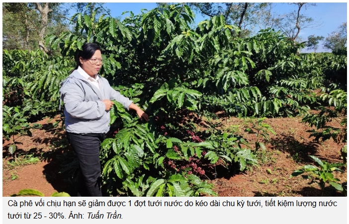 “Như vậy so với các giống cà phê hiện nay có chu kỳ tưới nước từ 25 - 30 ngày, tương đương trong suốt thời gian khô hạn ở Tây Nguyên cây cà phê cần tưới nước từ 3 - 4 đợt thì các dòng cà phê vối chịu hạn sẽ giảm được 1 đợt tưới nước do kéo dài chu kỳ tưới, tiết kiệm lượng nước tưới từ 25 - 30%”, Thạc sĩ Đinh Thị Tiếu Oanh chia sẻ.