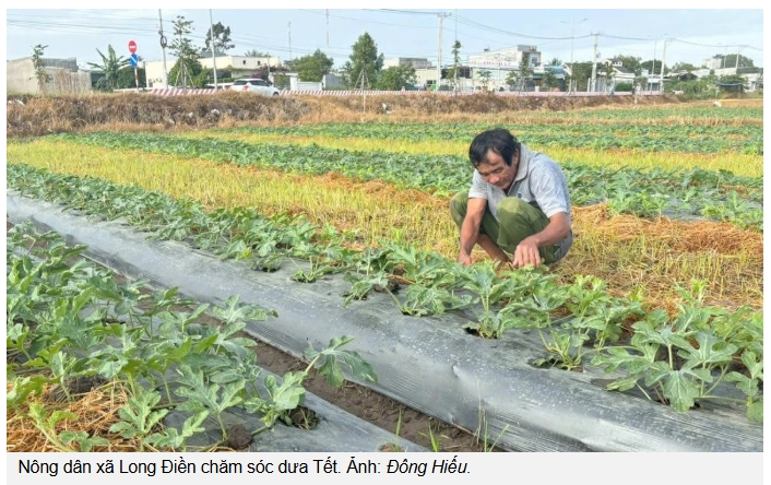 Cách đó không xa, ông Nguyễn Văn Lượm, xã Long Điền cũng đang tất bật chăm sóc vụ dưa Tết. Theo ông Lượm, hiện dưa đang phát triển tốt, hứa hẹn bội thu, tuy nhiên, giá cả phải chờ giáp Tết mới biết được. Nông dân chỉ mong thương lái mua giá cao chút để có lời, đón cái Tết ấm no.