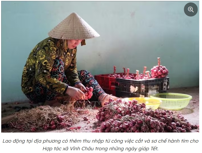 Vụ hành tím sớm về đích không chỉ mang lại lợi nhuận cho chủ ruộng mà còn tạo sinh kế sôi động cho hàng nghìn lao động địa phương, đặc biệt là người già và phụ nữ. Tại các điểm thu mua và sơ chế của Hợp tác xã Hành tím Vĩnh Châu, không khí lao động luôn nhộn nhịp với các công đoạn như lựa hành, bó chùm, phân loại và đóng gói.