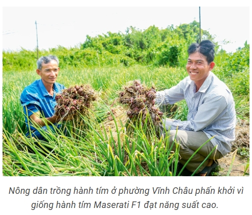 Vụ hành sớm năm nay, giống hành tím Maserati F1 cho năng suất hơn 2,5 tấn/công mang lại thu nhập khá cho gia đình ông Châu Hải Khánh, ở phường Vĩnh Châu. "Năm nay, thời tiết thất thường, ruộng hành tím giống địa phương bị hao hụt nhiều, bù lại ruộng hành tím Maserati F1 đầu tiên 1 công cho năng suất vượt hơn 30% so với giống hành tím địa phương. Trong thời gian tới tôi sẽ tập trung trồng hành tím Maserati F1" - ông Khánh phấn khởi cho biết.