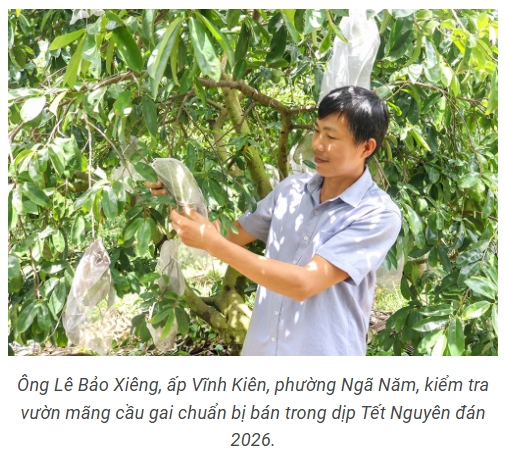 Ghé vườn mãng cầu của ông Lê Bảo Xiêng, ấp Vĩnh Kiên, phường Ngã Năm. Ông Xiêng cho biết, tôi có 1ha trồng mãng cầu thương phẩm bán trái quanh năm. Riêng mãng cầu bán chưng Tết sẽ chừa lại một số cây nhất định rồi xử lý cho cây ra hoa kết trái thu hoạch đúng thời điểm bán Tết. Tết Nguyên đán này, sản lượng trái thu hoạch ước hơn 1 tấn, giá bán khoảng 30.000-32.000 đồng/kg.