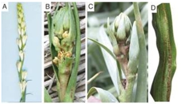 Tuy nhiên cây huệ đang bị một loại dịch hại gây thiệt hại nặng đến phẩm chất và có thể gây thất thu đến 100% .Nông dân thường gọi là bệnh “chai”bông huệ. Hình A:bông huệ khỏe cao >1 mét và mang 20 bông nhỏ, trắng