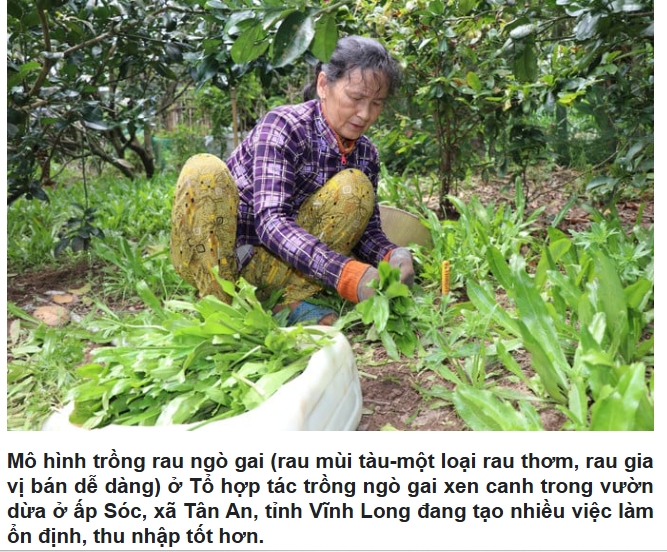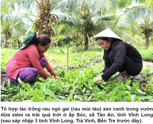 Tại xã Tân An, tỉnh Vĩnh Long mới (sau sáp nhập tỉnh Bến Tre, Trà Vinh) nhiều hộ nông dân đã liên kết với doanh nghiệp, thành lập Tổ hợp tác trồng rau ngò gai (rau mùi tàu-một loại rau gia vị, rau thơm nổi tiếng) xen canh trong vườn dừa xiêm, vườn mát đẹp như phim mà lại tăng thu nhập.