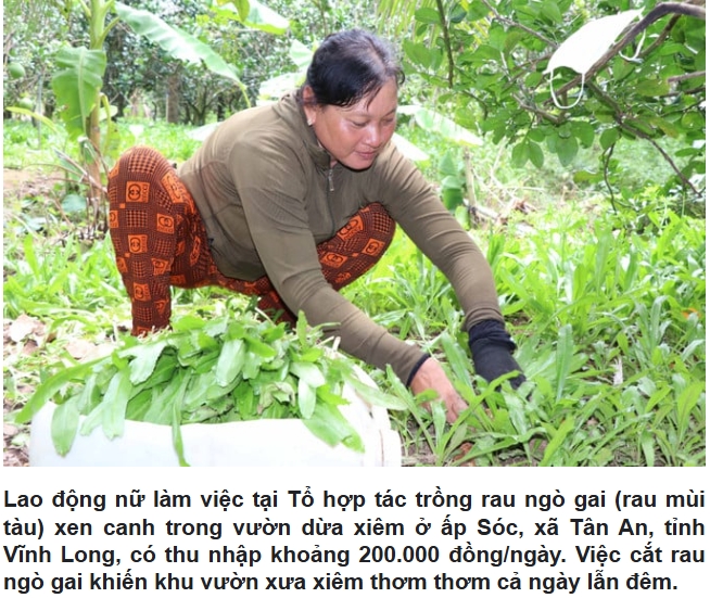 Lao động nữ làm việc tại Tổ hợp tác trồng ngò gai xen canh trong vườn dừa ở ấp Sóc, xã Tân An, tỉnh Vĩnh Long, có thu nhập khoảng 200.000 đồng/ngày.