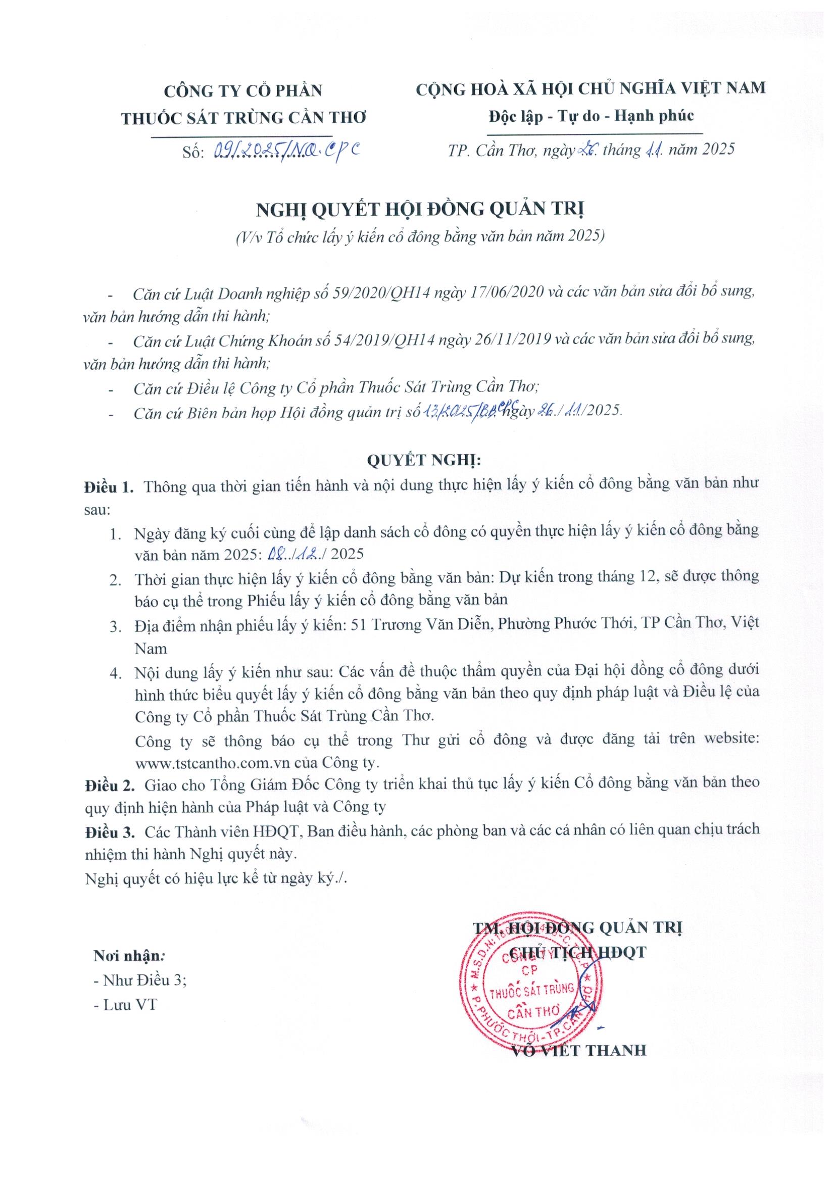 Nghị quyết HĐQT về tổ chức lấy ý kiến cổ đông bằng văn bản - 26/11/2025