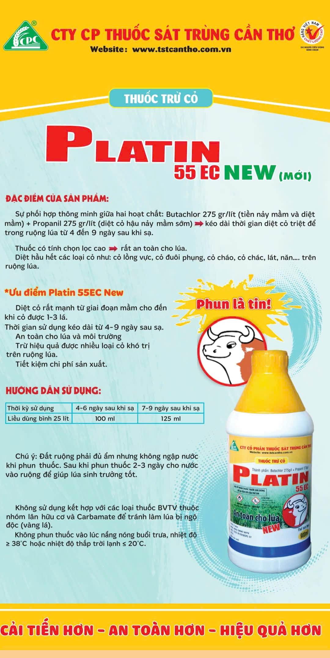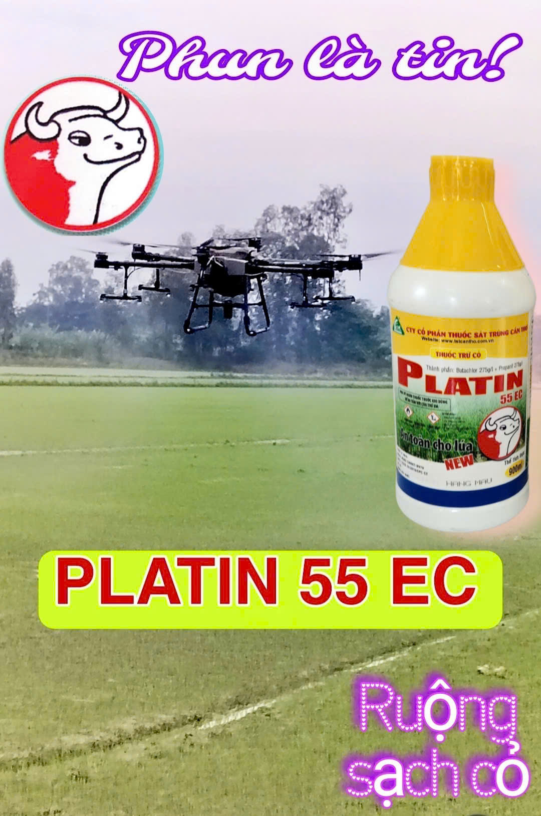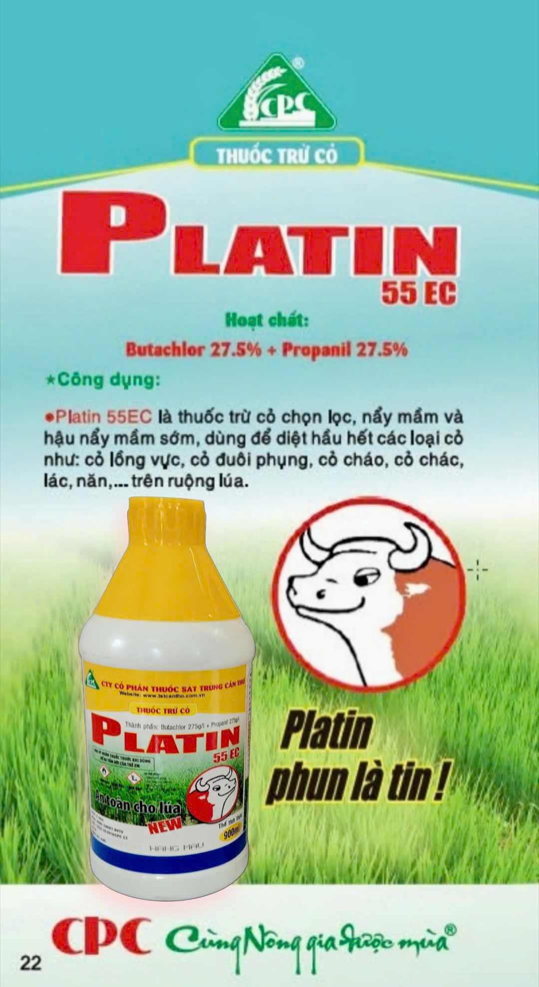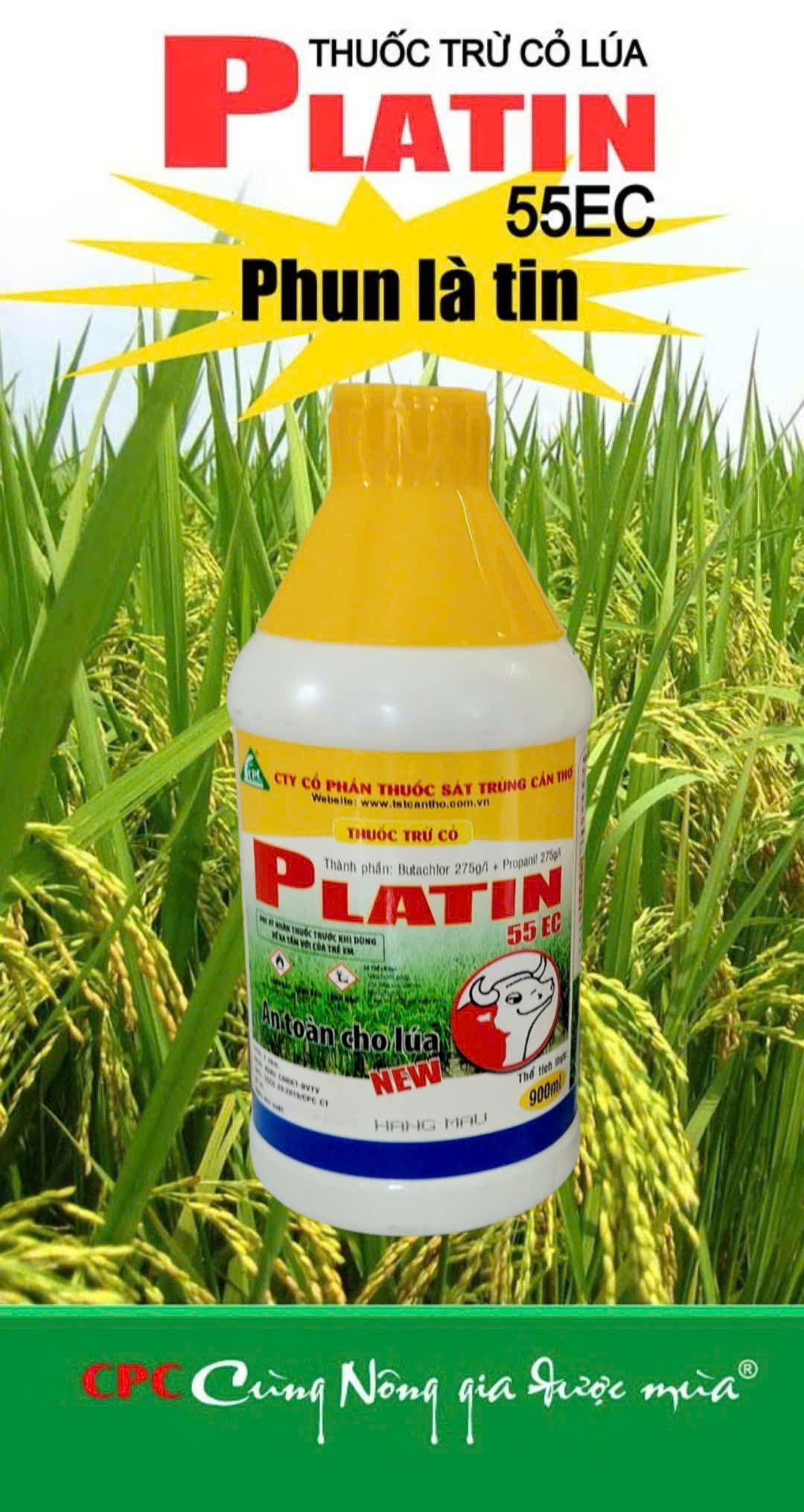 Platin 55EC là thuốc trừ cỏ chọn lọc, nẫy mầm và hậu nẫy mầm sớm , dùng để diệt hầu hết các loại cỏ như cỏ lồng vực, cỏ đuôi phụng, cỏ cháo, cỏ chác, lác, năn, ... trên ruộng ...
