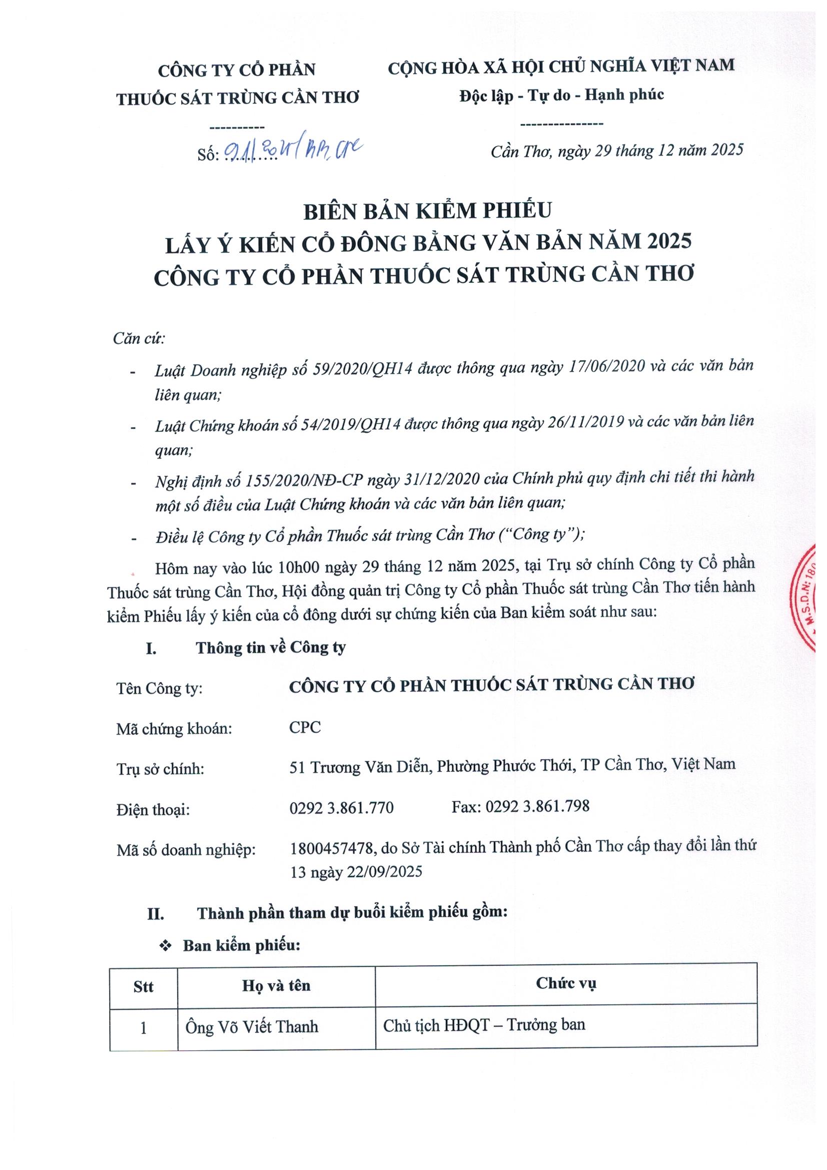 Ngày 29/12/2025, công ty CP Thuốc sát trùng Cần Thơ đã có nghị quyết ĐHĐCĐ lấy ý kiến cổ đông bằng văn bản. Sau đây là nghị quyết kèm biên bản kiểm phiếu