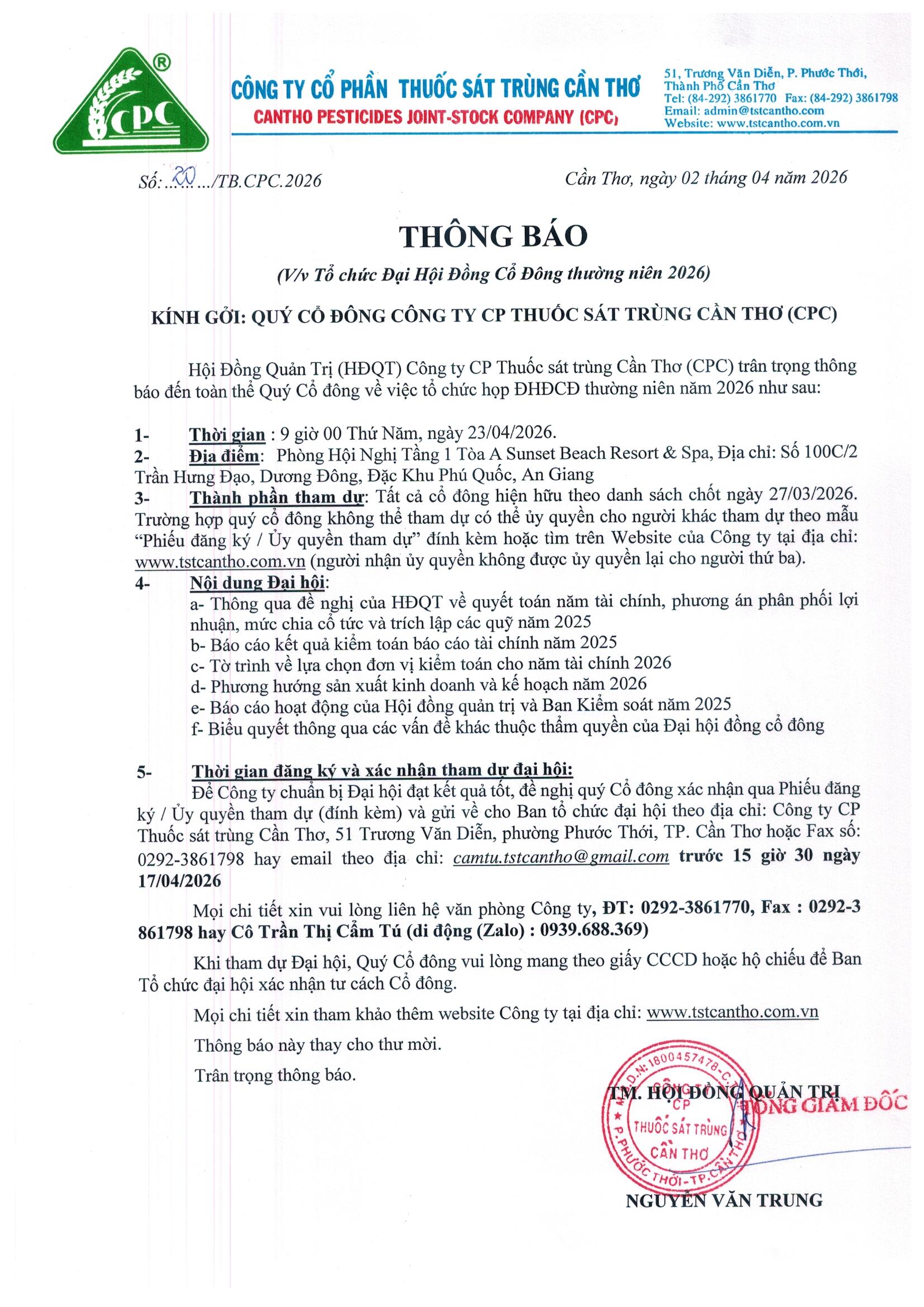 Hội Đồng Quản Trị (HĐQT) Công ty CP Thuốc sát trùng Cần Thơ (CPC) trân trọng thông báo đến toàn thể Quý Cổ đông về việc tổ chức họp ĐHĐCĐ thường niên năm 2026 như sau: