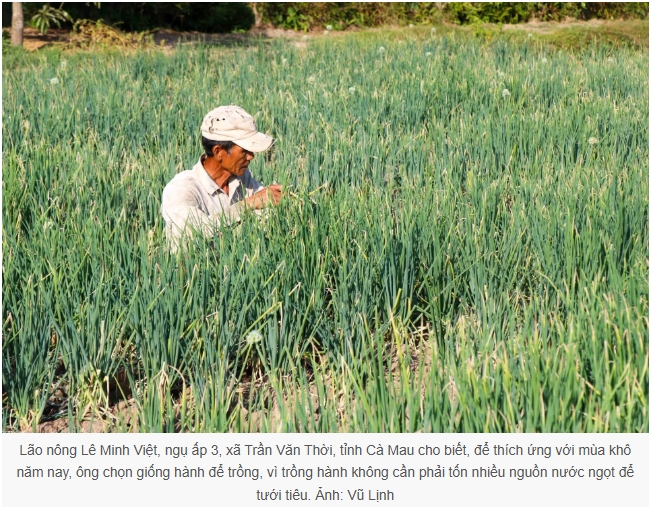 Lão nông Lê Minh Việt, ngụ ấp 3, xã Trần Văn Thời, tỉnh Cà Mau cho biết, để thích ứng với mùa khô năm nay, ông chọn giống hành để trồng, nhằm giảm áp lực nguồn nước ngọt để tưới tiêu.