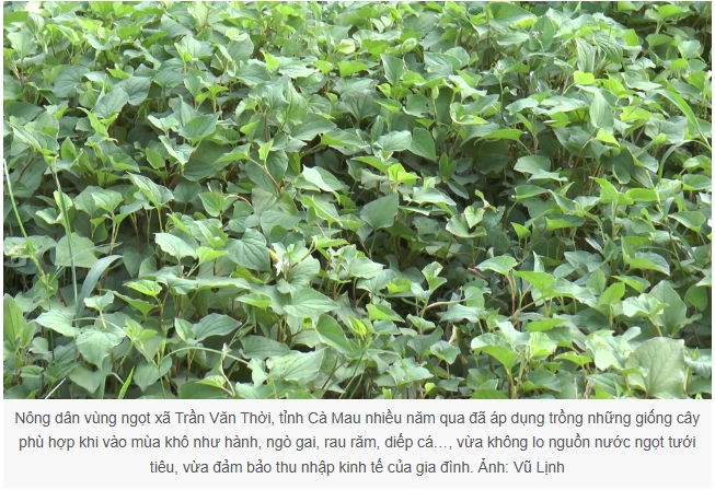 Nói về cách làm thích ứng với điều kiện nắng nóng, khô hạn như hiện nay, ông Bùi Trung Kiên - Bí thư Chi bộ ấp 3, xã Trần Văn Thời, tỉnh Cà Mau cho biết, thời gian qua, chính quyền địa phương thường xuyên tuyên truyền, vận động bà con trồng những giống cây phù hợp khi vào mùa khô như hành, ngò gai, rau răm… đồng thời vận đồng người dân tích luỹ nước tối đa trong mùa khô để chủ động trong sản xuất.