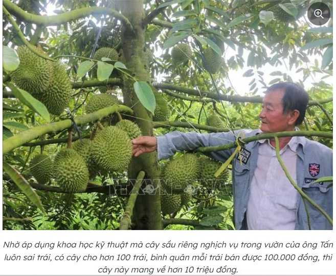 Chỉ vào cây sầu riêng nghịch vụ, sai trái, ông Tấn cho biết: "Cây này có hơn 100 trái, bình quân mỗi trái bán được 100.000 đồng, như vậy chỉ 1 cây như thế này đã mang về hơn 10 triệu đồng, cao gấp nhiều lần so với cây lúa và các loại cây trồng khác". Dự kiến vụ sầu riêng nghịch mùa này bán với giá 70.000 đồng/kg. Sau khi trừ chi phí, gia đình ông Tấn có thể thu về hàng tỷ đồng.