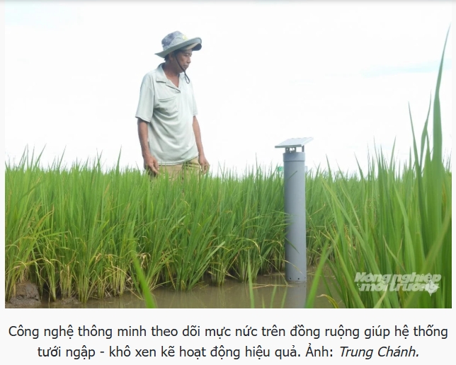 Nhiều cánh đồng tại An Giang còn được trang bị hệ thống tưới thông minh theo kỹ thuật ngập - khô xen kẽ (AWD), ruộng lúa được theo dõi mực nước, độ ẩm… thông qua cảm biến. Khi ruộng đủ khô theo ngưỡng định sẵn, máy bơm sẽ tự động được kích hoạt, tránh tưới ngập thường xuyên.