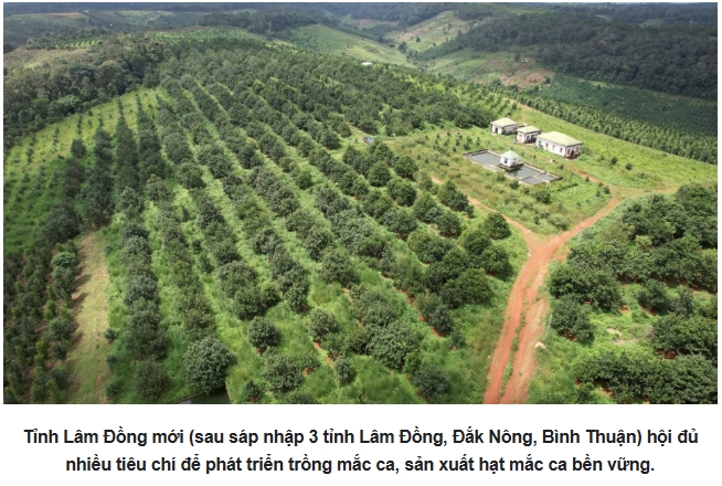 Lâm Đồng mới (sau sáp nhập tỉnh Đắk Nông, Lâm Đồng, Bình Thuận) có những vùng đất đỏ bazan màu mỡ, khí hậu mát mẻ quanh năm, điều kiện lý tưởng cho cây mắc ca sinh trưởng. Sau khi sáp nhập địa giới hành chính, Lâm Đồng chính thức trở thành “thủ phủ” mắc ca lớn nhất cả nước, với gần 16.000 ha.
