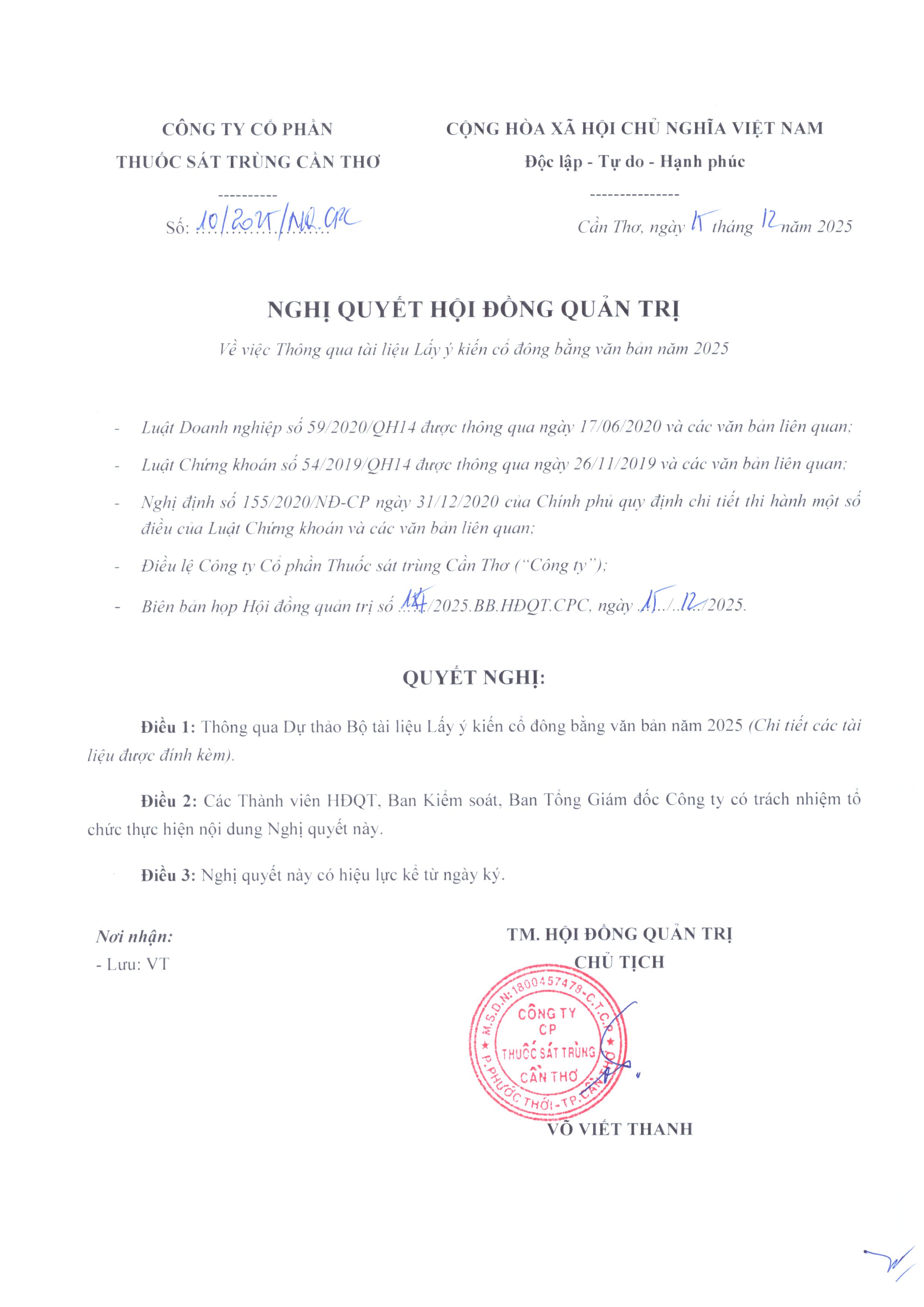 Ngày 15/12/2025, Hội đồng quản trị CPC đã có nghị quyết về tài liệu lấy ý kiến cổ đông bằng văn bản.