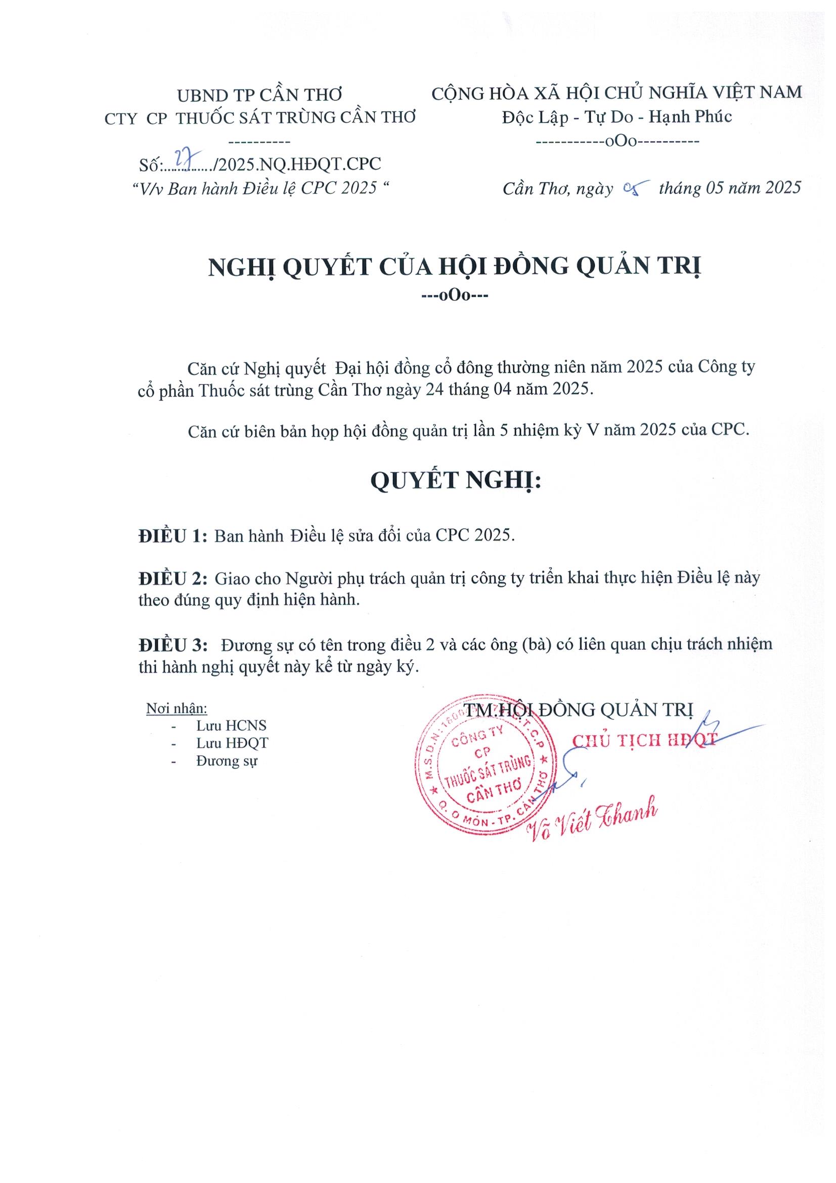 Ngày 05 /05/2025, Hội đồng quản trị Công ty cổ phần Thuốc sát trùng Cần Thơ đã có nghị quyết về Điều lệ CPC sửa đổi 2025